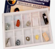 This collection is intended for use as handout material. Package dimensions (L×W×H), cm: 30×17.5×3. Weight, kg: no more than 0.25. The collection includes: apatite, bauxite (aluminum), nepheline, table salt, oil, calcite, fluorite, pyrite, sulfur, and wood.