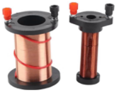 The device is designed for demonstrating electricity experiments in physics classes. The set includes two coils and a core. The coils have a cylindrical shape. The top panel features terminals for connecting the device to an electrical circuit.