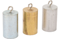 The set is designed for conducting laboratory work on measuring the volume and mass of a body, as well as studying the density and specific heat capacity of materials. It consists of three cylinders of the same size made of iron, aluminum, and plastic. Each cylinder has a small hook on top for hanging.
