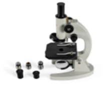 The stage measures 110x120 mm and is equipped with a slide holder featuring spring-loaded clips. It has a monocular viewing head. The set includes three achromatic objectives with magnifications of 4x, 10x, and 40x, and two eyepieces with magnifications of 10x and 16x. Illumination is provided by a mirror with two reflective surfaces.