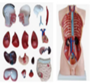 Made of polyvinyl chloride (PVC). The model consists of the following parts: torso; rib cage; head (2 parts); half of the brain (with a longitudinal section); right and left lungs; heart (2 parts); liver with gallbladder; kidneys (with a frontal section); stomach (2 parts); intestines (2 parts).