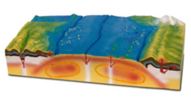 The educational model "Structure of the Seafloor Relief" demonstrates the main features of the ocean floor: the shelf, continental slope, trenches, underwater ridges, mid-ocean ridges, basins, and oceanic trenches.