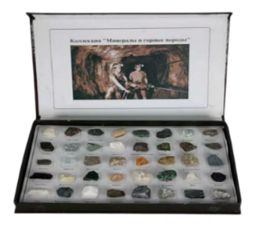 Contents: 1. Platy Gypsum (CaSO4H2O) 2. Calcite (CaCO3) 3. Fluorite (CaF2) 4. Magnetic Iron Ore (Magnetite) (Fe3O4) – Magnetic iron ore (natural magnet) 5. Crystalline Quartz (SiO2) 6. Bauxite (Al2O3nH2O) 7. Feldspar (Orthoclase) K[AlSiO8] 8. Muscovite Mica KAl2[AlSiO10] 9. Biotite Mica K(Mg,Fe)3[AlSi3O10] 10. Sulfur – S 11. Chalcopyrite (Copper Pyrite) CuFeS2 12. Graphite C 13. Pyrite FeS2 14. Chalcedony (Flint) 15. Dense Limestone (Composition – Calcite) 16. Marble (Composition – Calcite) 17. Basalt (Composition – Olivine, Augite, Feldspar) 18. Sandstone (Composition – Quartz, Feldspar) 19. Red Granite (Composition – Quartz, Mica, Feldspar) 20. Gray Granite (Composition – Quartz, Mica, Feldspar) Gemstones 21. Agate 22. Amazonite 23. Aragonite 24. Datolite Skarn 25. Serpentine 26. Chalcedony 27. Labradorite 28. Lapis Lazuli 29. Listwanite 30. Malachite 31. Nephrite 32. Obsidian 33. Ophiocalcite 34. Mother-of-pearl 35. Radonite 36. Radusite 37. Smoky Quartz 38. Fluorite 39. Charoite 40. Jasper.
